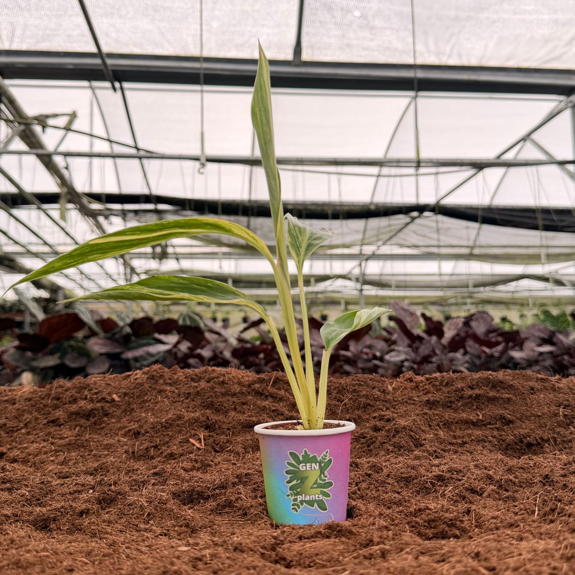 Perfect for decorative groupings, bright indoor displays, or tropical-themed collections, this Alpinia variety brings visual freshness without overwhelming the space. Even in a 2" pot, it feels dynamic and full of potential. The variegation brightens shelves, windowsills, and retail setups, making it ideal for capturing attention. Its shape and coloration pair beautifully with gingers, calatheas, or large-leafed foliage plants.