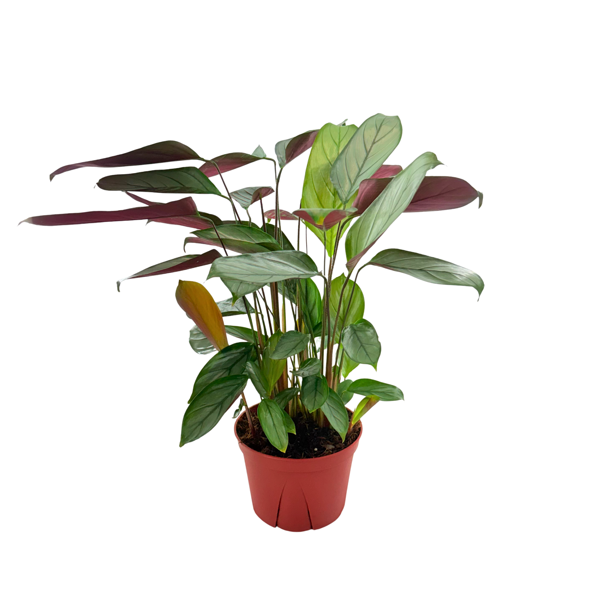 In its 6" form, Calathea Grey Star displays graceful, elongated leaves that shimmer with silvery tones under natural light. Each leaf features delicate, dark green veins that emphasize its refined texture, while the underside glows with rich purple hues — a signature trait that adds visual depth and interest. The leaves naturally fan outward, giving the plant a lush, layered appearance that feels both lively and serene.