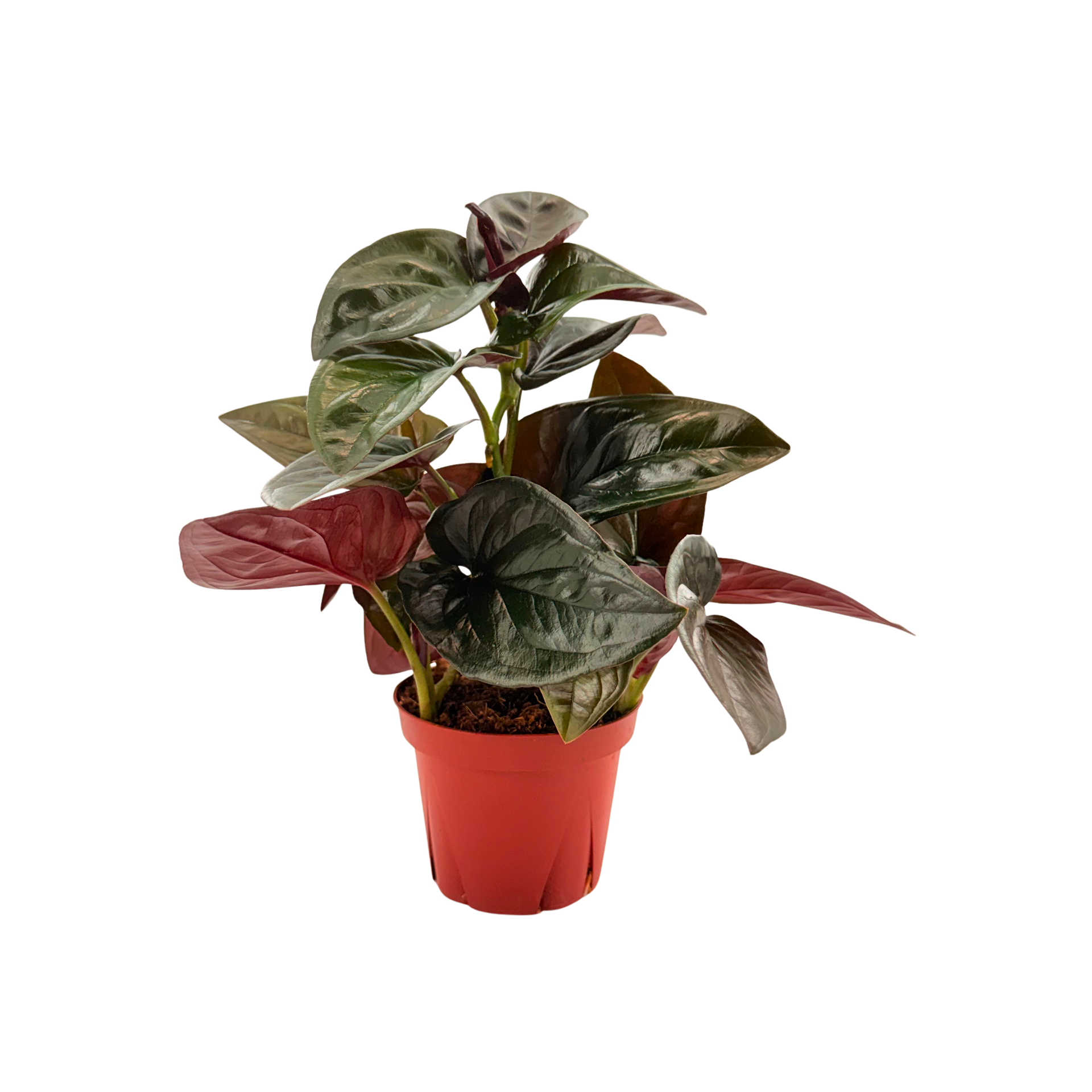 Syngonium Red Arrow is loved for its sophisticated color palette and refined leaf shape. The foliage displays deep green to dark burgundy tones on top, while the undersides reveal a rich, velvety red. Slender stems echo this wine-colored hue, adding depth and contrast throughout the plant. Even in a 4-inch size, it carries a mature, moody elegance that feels exotic and high-end.